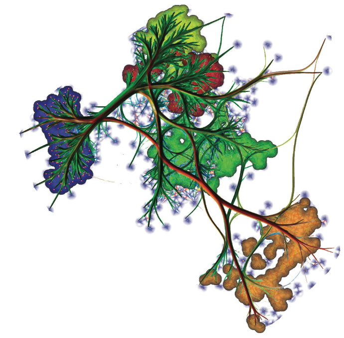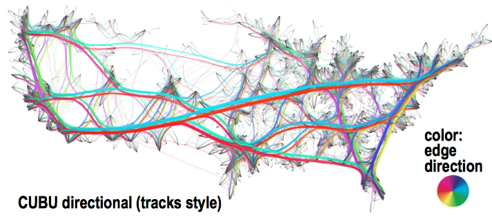 CUBu allows one to generate tens of visual/bundling designs in seconds, by simply manipulating its various parameters. This enables the exploration of a large visual design space, leading to interesting, intriguing, and salient visualizations that are at the crossroads of image synthesis, image processing, and scientific and information visualization. Below is such an example (image taken from the cover of our recent data visualization book?)