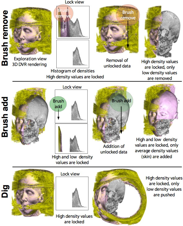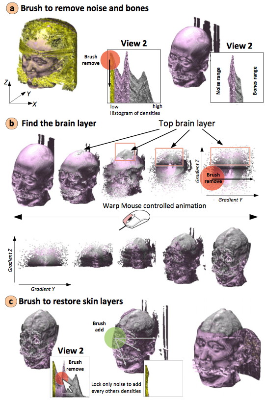 Given a CT scan, we want to expose the top part of the brain. For this, we have to remove the soft skin tissue (but keep the similarly soft brain tissue) in the top area; and keep all tissues in the bottom area. This is done using Color Tunneling by three simple interactive operations involving the 3D scan and its tissue-gradient 2D histogram, as shown in the image below.