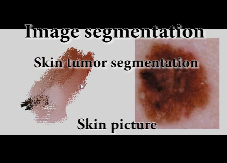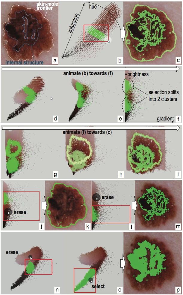 Given a 2D skin image, we want to accurately segment the inner, respective outer, structures of a skin mole surrounded by healthy skin. This is done using Color Tunneling by five simple interactive operations involving the 2D image and its brightness-gradient and saturation-hue scatterplots, as shown in the image below.