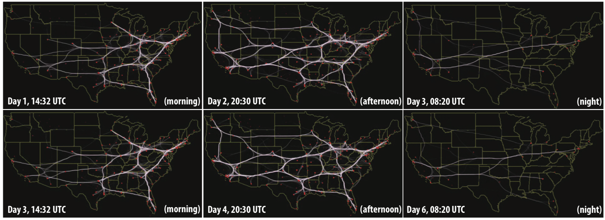 The image below shows six snapshots of a streaming graph depicting flights over North America over a period of 6 days (41K edges in total). The dynamic bundling runs in real time thanks to the GPU implementation of KDEEB and shows organic bundle structures smoothly changing over time.