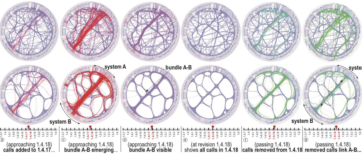 Red indicates calls inserted at some moment in time; green indicates calls removed. We see an interesting pattern of many calls being first inserted, then removed, between the same software components. Upon closer analysis, this indicates some massive refactoring events.