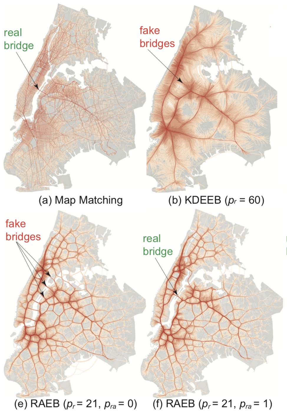 The image below shows two simplification levels (bottom row) produced by RAEB on a dataset of New York taxi trips (100K trails), compared to map matching and plain KDEEB (top row). RAEB simplifies more than map matching, but less than KDEEB, while respecting the road network less than map matching but much better than KDEEB.