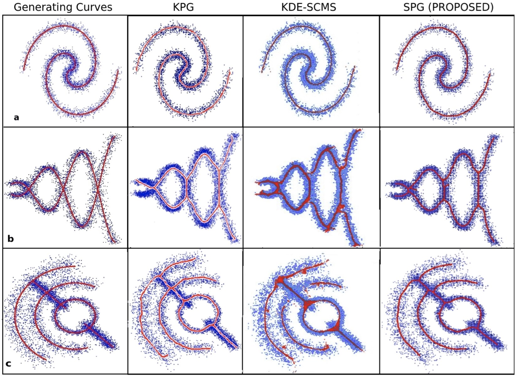 The image below shows PGs for several scatterplots computed from ground-truth generating curves (left column). The next columns show PGs computed by the KPG method, the SCMS method, and our method (SPG). Our method is of at least the same quality as KPG and SCMS with respect to approximating the ground truth.