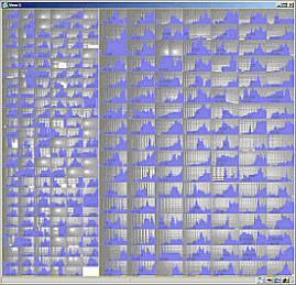 We implemented several chart types such as line and bar graphs and pies. Charts can be embedded into any treemap cell. The image below shows a three-level treemap with stock trades grouped by industry branch, company, and day, overlaid with timelines for stock prices.