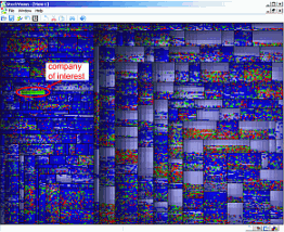 The image below shows such a treemap with three levels: industries, companies, and share prices per day for the RASDAQ stock exchange (part of the Romanian Stock Exchange) over several months in 2006. The first two levels use a squarified layout and shaded cusions. The third level uses a strip layout, ordered by date, and red-to-blue-to-green colors indicating price. Light blue shows missing data entries. A highlighted cell shows an outlier, emerging, company with very strong price increases.