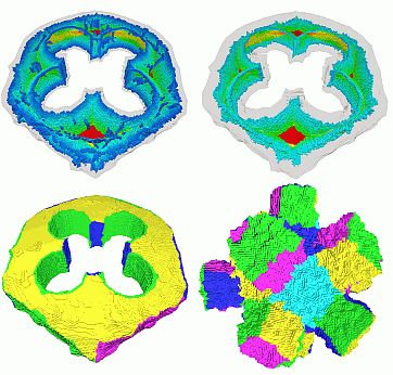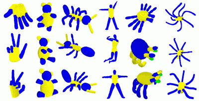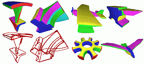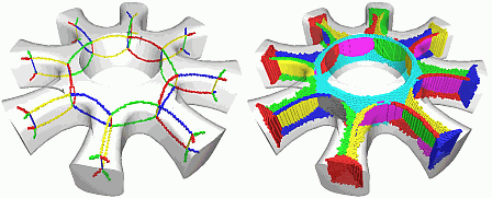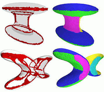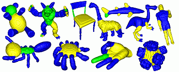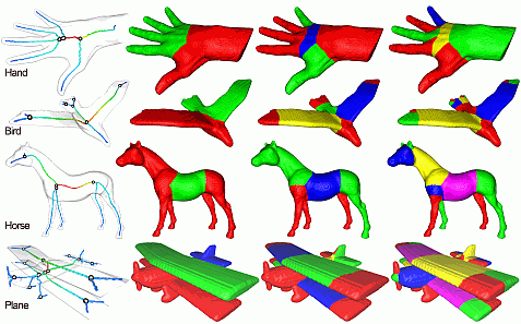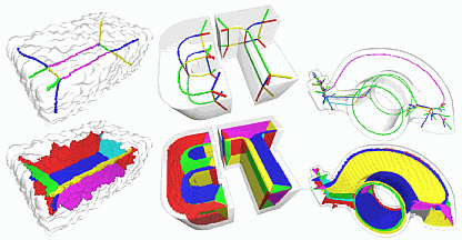 The image below shows the Y-network (top0 and segmented surface skeletons (bottom) of several shapes. Note that the segmentation is robust even for noisy objects.