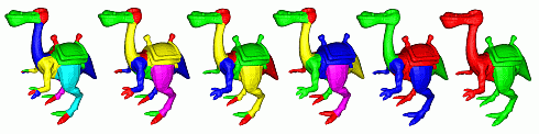 A desirable property of our method is that segmentations are pose invariant. That is, given an articulated object, its different instances, or poses, will be segmented in effectively the same way. This is shown below on several shapes from the McGill shape benchmark.