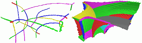 We can also apply our method to segment curve skeletons. The images below show the segmented curve skeletons (left) and surface skeletons (right) of two shapes from the INRIA 3D shape database. The original 3D meshes were voxelized prior to skeletonization and segmentation.