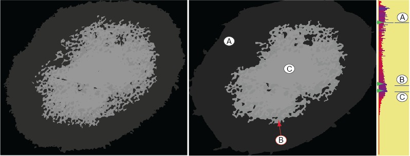 Middle image: The tumor has been selected here into three structures (A, B, C). The right bar-plot shows the relevance values for all 255 threshold-sets in the image. Note how the levels corresponding to the three salient structures A, B and C correspond to local relevance maxima. This allows detecting, and thus segmenting, such images using a simple automatic local maxima detection.