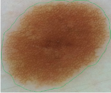 The image above shows a reticulated-pattern tumor. The green contour indicates a manual segmentation performed by a dermatologist. Note how the contour