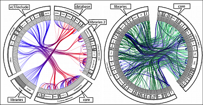 The C/C++ visual IRE is integrated with several third-party visualizations. The image below shows the function-level call graphs of two software systems. The call graphs are extracted using our IRE and visualized using an extended hierarchically bundled edge technique. We immediately see that the left system is more modular than the right one.