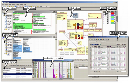 Below is a snapshot of the current development of the IRE. Queried code patterns are highlighted over the actual source code using a dense-pixel technique. Metrics can be interactively computed over selected constructs (such as functions or classes) and visualized with a table lens widget. UML diagrams and metrics can be extracted directly from source code. Finally, the results can be exported to a SQL database for third-party tools.