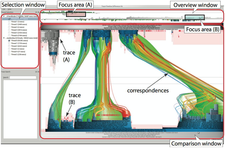 The image below illustrates the main features of our TraceDiff tool. Users can select two or more traces to compare (left window); next, time-ranges of significant execution differences are automatically highlighted (overview); selecting such a range shows a multiscale comparison of the two traces executions in the main comparison window.