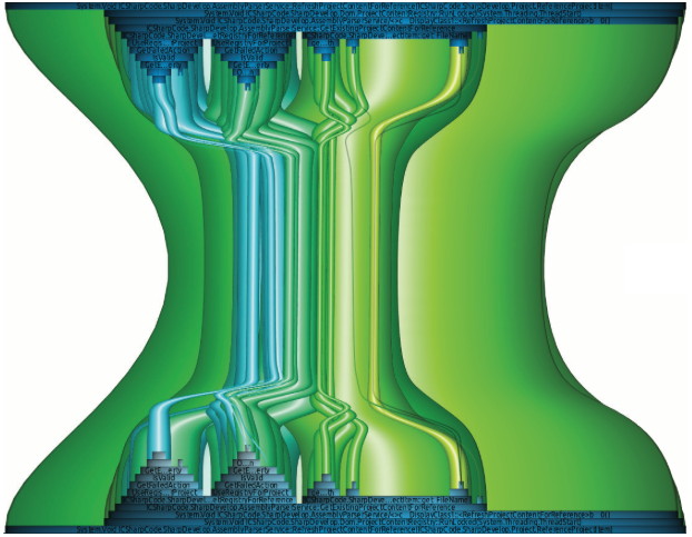 We used our TraceDiff tool to find execution-trace differences for software systems ranging up to over 1M lines-of-code and 1K function calls. For instance, running such a system with similar inputs, and next finding trace differences, allowed us spotting anomalous execution divergences which, in the end, indicate program problems (bugs or suboptimal code). The figure below shows a snapshot from such a large-program trace comparison. Color encodes function call moments. Shifts in the blue-to-red color gradient indicate permutations in the function-call order, which in turn indicate execution problems.