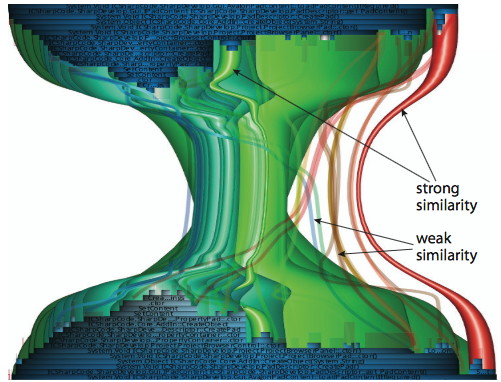 To compare traces, we developed an extended correspondence-based bundling algorithm, that is able to show both coarse-scale correspondences (matches) but also fine-scale matches in context. Our algorithm uses an extension of the classical shaded tubes method we developed earlier for multiscale compound-graph visualization. The figure below illustrates our design.