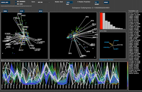 Subspace Explorer is a Java tool for the interactive visual exploration of multidimensional infovis datasets. It offers a set of linked views featuring different visual exploration techniques: parallel coordinates, scatterplot matrices, multidimensional projections, and biplot axes. While not as sophisticated and customizable as ProjectionExplorer, Subspace Explorer is considerably easier to use and requires no programming at all. Input datasets can be easily supplied in plain text file (see tool's documentation). This is a great place to start learning about multidimensional data visualization. Details about how to use the tool are provided in the accompanying publication below.