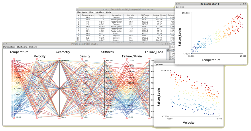 Xdat is a Java tool for the interactive exploration of multidimensional datasets using parallel coordinates and scatterplots. It offers the standard features of the these two plot types, such as axes reordering, observation selection, brushing, and multiple linked views. Input datasets can be supplied in a simple text-based tabular format. The tool is as easy to use as Subspace Explorer (though, it offers slightly less features). It is a very good place to start learning how parallel coordinates work in conjunction with scatterplots.