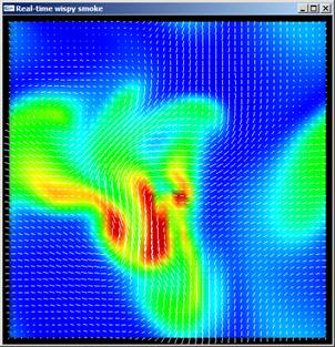 Just run the smoke.exe application. You will get a text window showing some help messages and a graphic window. Select the graphic window. To control the simulation, left-click and drag the mouse. To change the visualization and/or simulation options, press use the indicated keys in the graphical window. After a bit of experimenting, you should be able to create some images like the ones shown below: