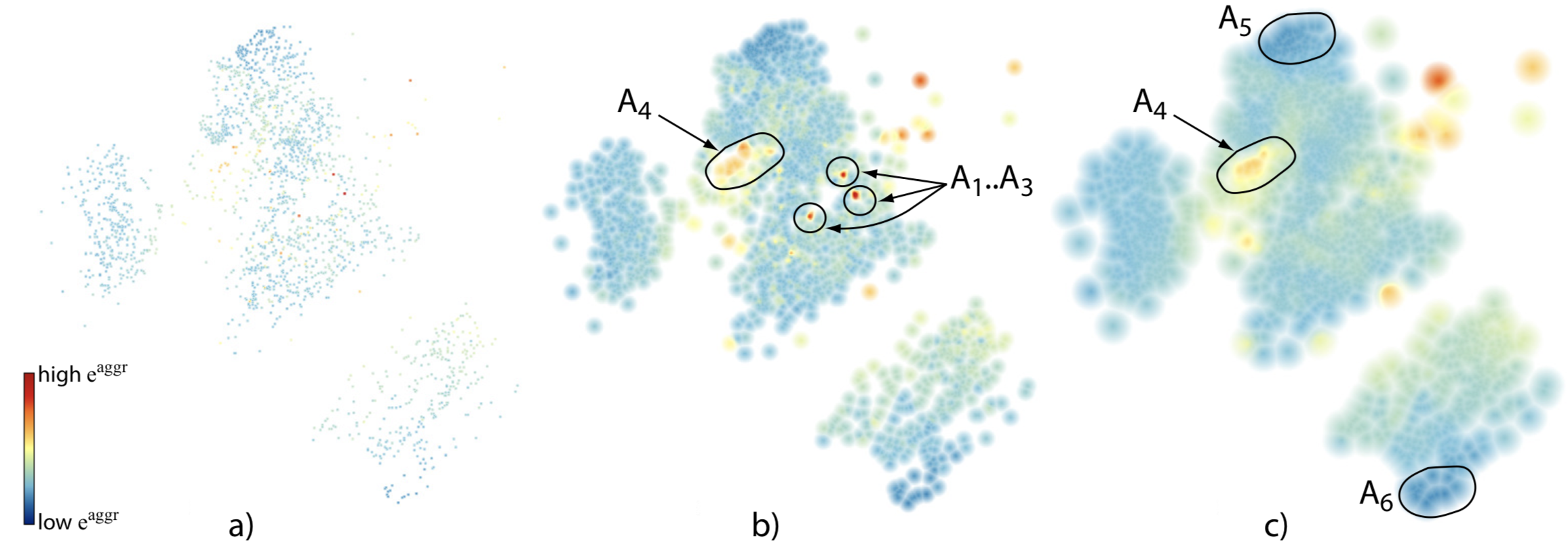 For each sample, we measure the (normalized) difference between the distance between that sample and all others in the dataset. We encode this using a multiscale scheme: Users can tune the scale parameter to highlight local variations, or conversely, show only more global patterns. The image below shows this, at three scale levels (fine to coarse, left to right). Red hot-spots indicate projection points having high aggregate errors. As visible, this projection is overall good, since there are only a few hot-spot islands.
