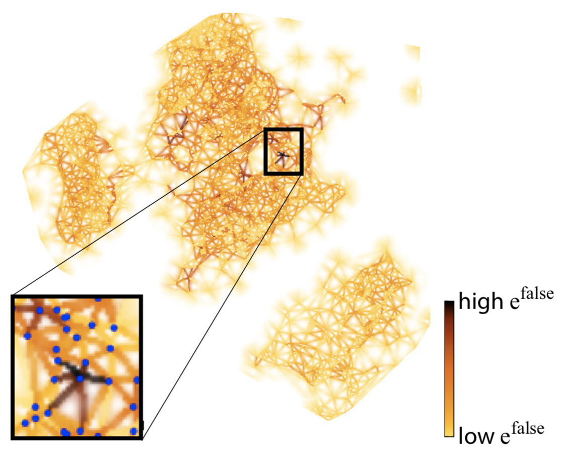 We refine the aggregate error to be more specific: We define false neighbors to be samples placed too close in 2D as opposed to the high-dimensional space. We show this metric by doing a Delaunay triangulation of the 2D projection scatterplot, computing the distance-mismatch error for the triangle-fan vertices around each 2D point, and color-coding the respective fan edges. The image below shows this for the same projection as above. Dark Delaunay edges show points having (many) false neighbors. As visible, there are only a few such points in this projection.