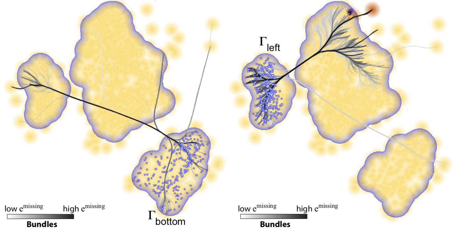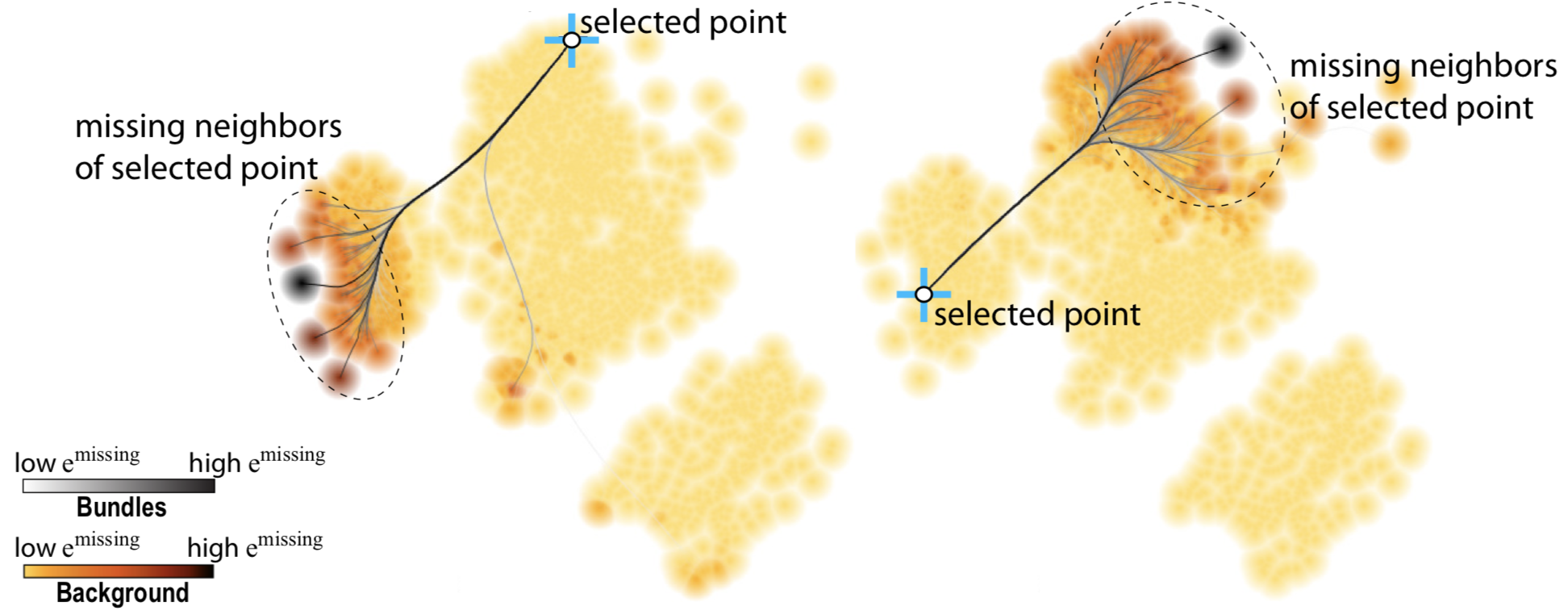 These are the complement of false neighbors, i.e., points which are close to a sample in the high-dimensional data, but placed too far in the 2D projection. Unlike false neighbors, we cannot (easily) visualize all false neighbors in a projection, since, for each point, these may be scattered anywhere in the 2D space. Hence, we let the user to select a projection point, then find its false neighbors in the projection, link them with lines to the point, and finally bundle these lines (using CUBu), to reduce clutter. The image below shows this for two points. We see how the left part of the projection has missing neighbors placed in its right part, and conversely.