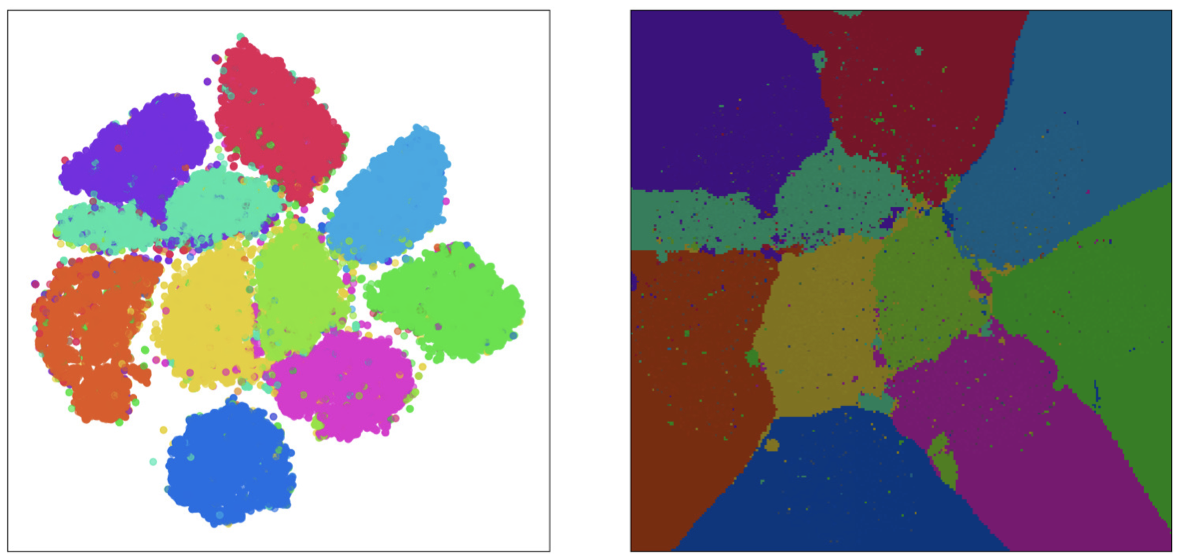 The left image below shows the well-known MNIST dataset, projected by t-SNE. The right image below shows the decision zones (compact color areas) and decision boundaries (where two color meet) computed by our method for this dataset. Our visualization extrapolates from the sparse scatterplot (left) to a dense, compact, visualization of the decision process (right).