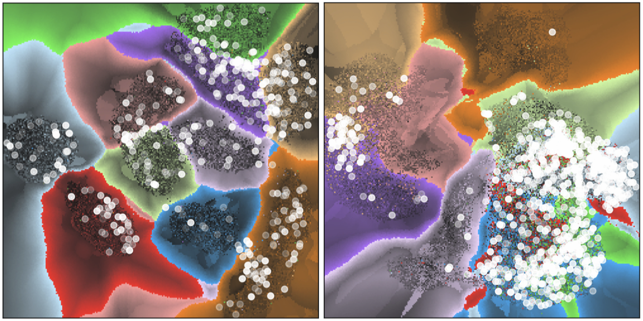 But we can do better: We can show the actual distances from a point (in the 2D image) to the closest decision boundary. This tells where in nD space we are close to a decision boundary, thus, we may encounter classification problems. The next image shows these distances (luminance-encoded) with misclassifications shown as white dots, for the well-known MNIST (left) and FashionMNIST (right) datasets. Dark Delaunay edges show points having (many) false neighbors. As visible, there are only a few such points in this projection.