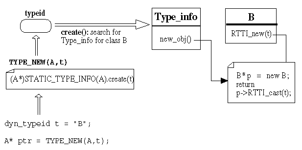 The macro TYPE_NEW which implements run-time object creation needs two parameters. One of them is a typeid t for the type T we want to instantiate. The other one is a C++ class name of a base class B of T. The second parameter is necessary since we have to return the newly created object as a typed object. In other words, TYPE_NEW(B,T) will create a new T and return it as a B*.